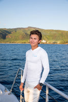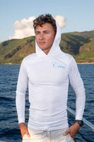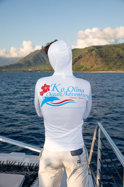 Ko Olina Ocean Adventures 100% Polyester white long sleeve logo shirt. Featuring a "Crew" on the front chest and a full color logo on the back, with pink hibiscus sleeves on each arm. Stay safe from the sun's rays or while at sea.